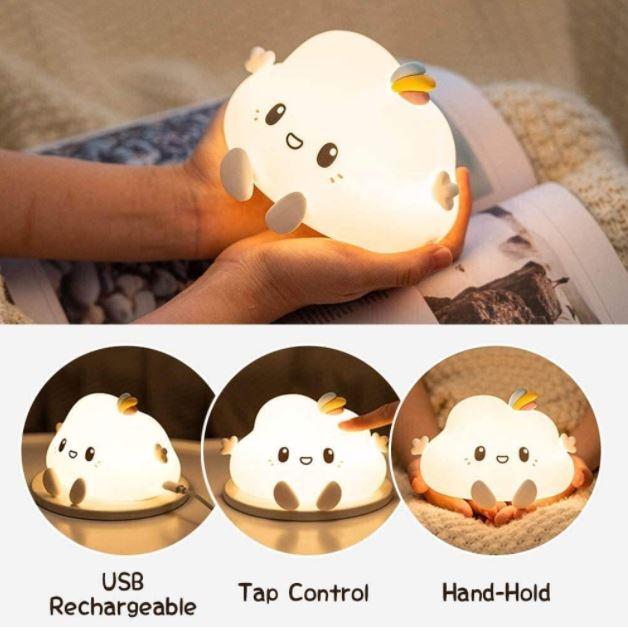 This Kawaii Cute Cloud Silicone USB Rechargeable Night Light Lamp makes an excellent gift for kids, friends, and family (Including yourself)! It can be used as a cool night light for kids, or a unique decor for your bedroom, living room, or office. Just by tapping or squishing, you can turn on the night light!